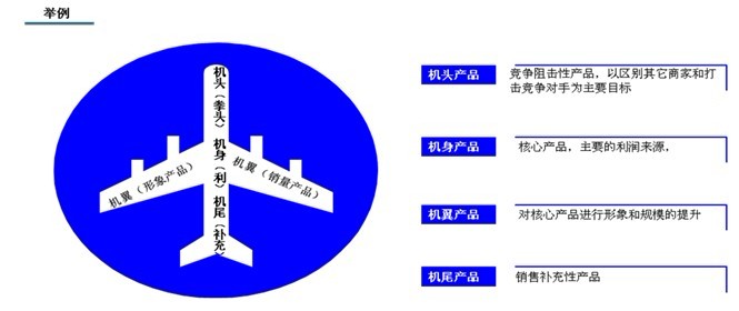 明確產(chǎn)品結(jié)構(gòu)的劃分,對(duì)于不同品牌和品類產(chǎn)品賦予不同的市場功能,從而結(jié)合市場競爭態(tài)勢(shì)推出競爭導(dǎo)向的產(chǎn)品設(shè)計(jì)和定位。就此我們可以推出飛機(jī)型產(chǎn)品組合拳。