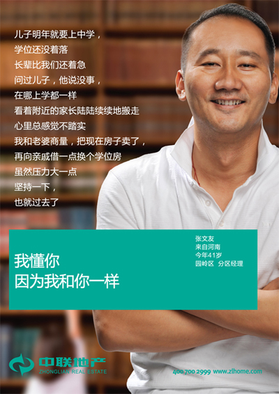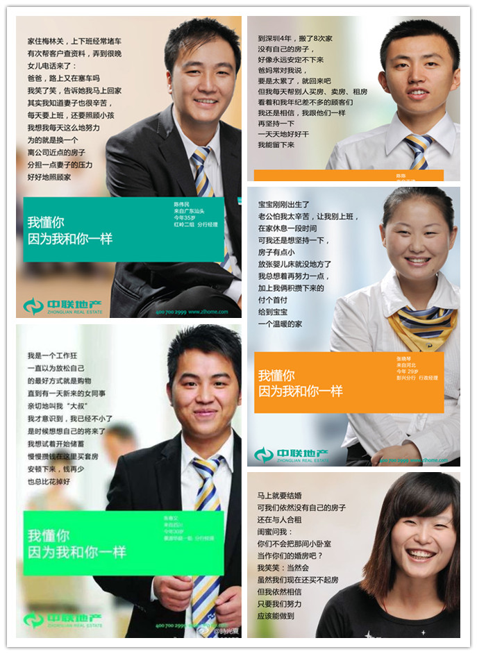 第一,形象海報(bào)中所選取的人物形象。他們都是中聯(lián)地產(chǎn)的內(nèi)部員工,他們都是工作在中聯(lián)一線店面的員工,他們都是直接面對(duì)客戶的員工,他們都是最普通的員工。為中聯(lián)地產(chǎn)代言的,不是任何的明星,不是任何的名人,他們只是和大多數(shù)人都一樣的普通人。其實(shí),員工才是企業(yè)最好的代言人,勝過明星,例如全球最大連鎖零售商沃爾瑪只用員工或員工兒女做代言或模特,既省錢又親民。