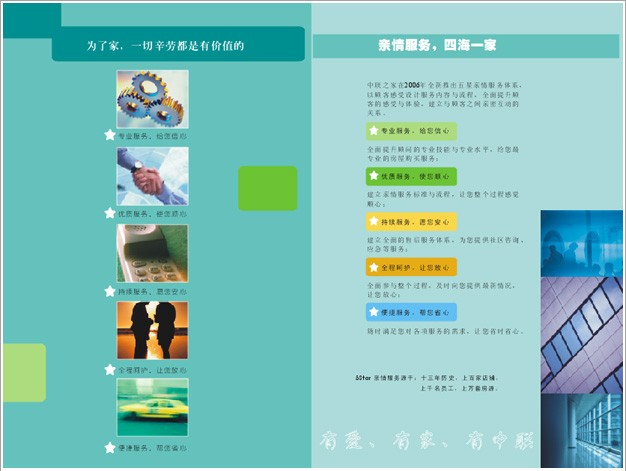 因此,我們為中聯地產打造了以“將心比心,服務貼心”為主題的五心親情服務,用信心、順心、安心、放心、省心來全力支持“對客戶熱心”。