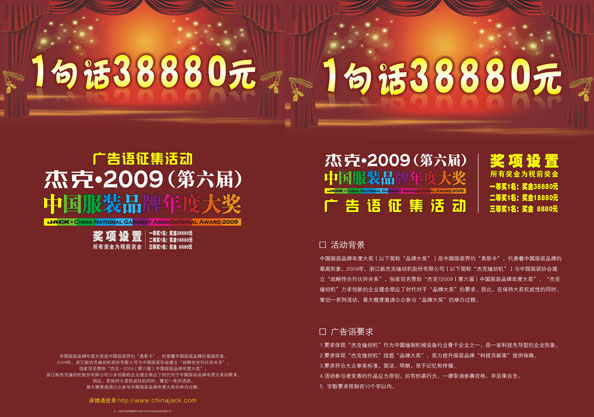 是以,南方略策劃以38880元的高額獎金,向全國公開征集杰克廣告語。活動為期一個月,共收到廣告語作品33678條,來稿作者遍及北京、上海、浙江、河南、福建等三十多個省、直轄市。國內一些知名媒體、創意工作室和策劃公司的專業人士也寄來了投稿。經過南方略項目組與杰克評審團逐一篩選,最終確定“一線科技,盛裝天下”為杰克新的廣告語。