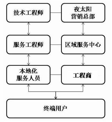 意識(shí)到時(shí)間問題的嚴(yán)重性,夜太陽(yáng)制定了服務(wù)本地化三原則:維修人員本地化、備用配件本地化和備換整機(jī)本地化。維修人員本地化就是對(duì)工程商的技術(shù)人員進(jìn)行相關(guān)技術(shù)培訓(xùn),使他具備處理應(yīng)急問題的能力,最大限度降低因產(chǎn)品問題帶給終端用戶的損失;備用配件本地化、備換整機(jī)本地化就是在技術(shù)服務(wù)中心存放一定量的配件和整機(jī),方便嚴(yán)重問題產(chǎn)品的及時(shí)更換。圍繞這三條原則,夜太陽(yáng)構(gòu)建起了三級(jí)服務(wù)體系。