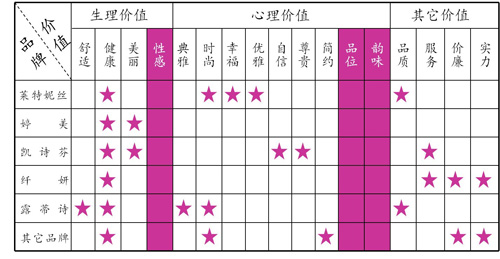 南方略發(fā)現(xiàn),調(diào)整型內(nèi)衣行業(yè)的產(chǎn)品屬性同質(zhì)化現(xiàn)象嚴(yán)重,各品牌都開始在概念上下功夫。同時(shí),品牌價(jià)值訴求也存在嚴(yán)重的同質(zhì)化現(xiàn)象,多數(shù)企業(yè)都在吆喝自己的調(diào)整型內(nèi)衣產(chǎn)品的“健康”與“時(shí)尚”,至于“性感”、“品位”、“韻味”等概念則鮮有涉及。同時(shí),市場中不乏染指“東方”的概念,與衣馨的“東方女性形體顧問”類似,但卻缺乏真正將其表現(xiàn)到位的品牌…… (圖5)