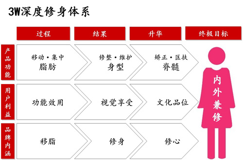 基于“內(nèi)外兼修”的理念,南方略構(gòu)建了以產(chǎn)品功能、用戶利益和品牌內(nèi)涵為維度的“3W深度修身體系” (圖6),倡導(dǎo)分別以“移脂”為過程、“修身”為結(jié)果、“修心”為升華的“3W深度修身”新風(fēng)潮。并建議將“品位”和“韻味”作為衣馨品牌的核心價(jià)值,建立以“韻味”為核心的品牌價(jià)值體系,一方面深化衣馨品牌的內(nèi)涵與外延,一方面建立起于競爭品牌之間的區(qū)隔。(圖7)