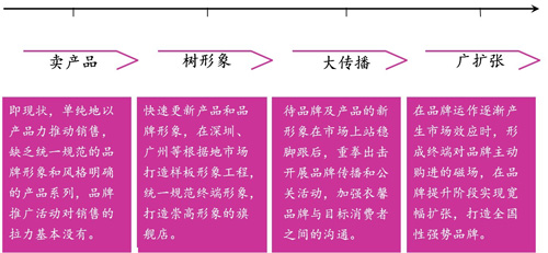 為了配合實(shí)現(xiàn)成為區(qū)域知名品牌的近期目標(biāo),及行業(yè)領(lǐng)導(dǎo)型品牌的長期目標(biāo),南方略為衣馨描畫的是這樣的一條路徑(圖9),即是:以產(chǎn)品品質(zhì)為驅(qū)動,重新塑造別具特色的品牌形象,再針對品牌的個(gè)性和核心價(jià)值進(jìn)行多層次、全方位的整合營銷傳播,建立起衣馨品牌在目標(biāo)消費(fèi)者心智中的獨(dú)特占位,穩(wěn)固推進(jìn)終端零售網(wǎng)點(diǎn)的擴(kuò)張以及品牌戰(zhàn)略的穩(wěn)固向前,最終實(shí)現(xiàn)品牌的可持續(xù)發(fā)展。