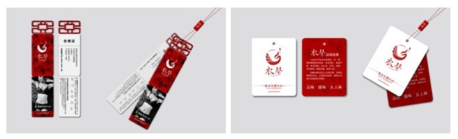 至于吊牌,南方略則提出了以上兩套備選方案(如圖20、圖21所示)。兩者皆為深紅打底,“花開富貴”。一則取形古典屏風(fēng),賞心悅目之余,更讓人聯(lián)想到秦觀《浣溪沙》中那“淡煙流水畫屏幽”的意境;“一切盡在不言中”,讓衣馨品牌對于傳統(tǒng)文化的繼承和詮釋以潤物細(xì)無聲的形式,悠然遁入消費(fèi)者的視野和內(nèi)心。一則用簡單大方的造型,直接展現(xiàn)衣馨內(nèi)衣的“品牌故事”——