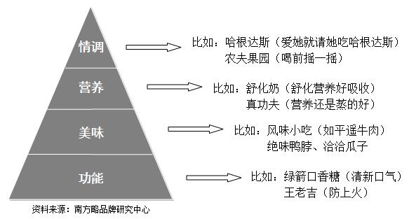 如上圖所示,這可以說是馬斯洛需求層次理論在食品行業中的實踐版。從消費者需求層次層面來劃分的話,食品的價值屬性由低到高可歸結為四類:功能、美味、營養和情調。