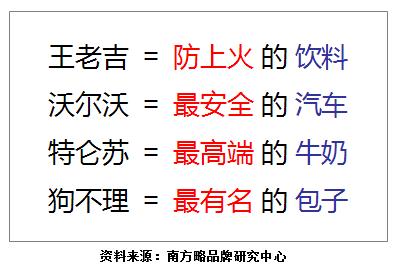 南方略咨詢機構認為,定位的本質是在消費者心智中建立起類似的等式。如果你夠細心的話,也許你已經發現其中的微妙。紅色字體部分(防上火、安全、高端、有名)其實是品牌的價值屬性;而藍色字體部分(飲料、汽車、牛奶、包子)則是品牌的市場選擇所在。市場選擇界定了品牌將會“在哪里競爭”,價值屬性則明確地回答了品牌“憑什么去競爭”。品牌之所以要定位,不就是為了有利于市場競爭么?這就是為什么競爭大師麥克·
