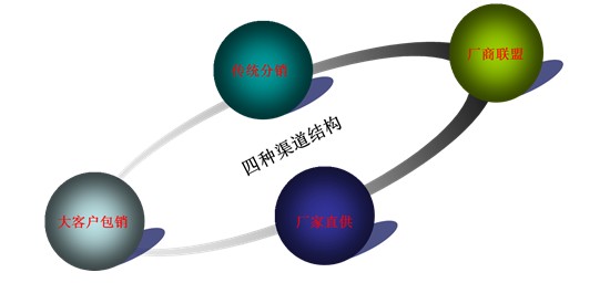 廠家直供:主要是針對政府及行業(yè)性招標采購、“麥德龍”等實施統(tǒng)一采購的連鎖商超、電子商務(wù)等特殊通路,實施以公司總部為談判核心的廠家直供渠道模式。其渠道結(jié)構(gòu)為:廠家(→代理商)→最終用戶,其產(chǎn)品系列可單獨設(shè)計。