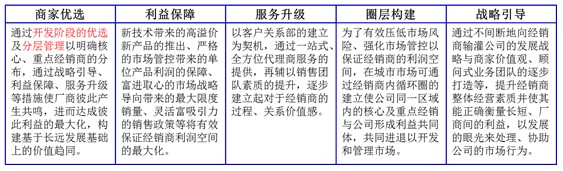 通過廠商互補以開發(fā)維護市場:以核心、重點經(jīng)銷商為主要對象,市場開發(fā)與維護逐步實現(xiàn)由經(jīng)銷商單干的放羊式銷售向經(jīng)銷商為主、公司人員協(xié)助的協(xié)銷模式發(fā)展,最終發(fā)展為廠商共同開發(fā)維護市場的聯(lián)合式分銷模式。