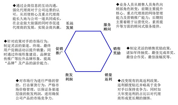 鎖定重點市場、豐富品類組合、細分渠道類型、優(yōu)化分銷網(wǎng)絡(luò)、完善服務(wù)機制、打造價值體系是“蜂巢工程”賴以成功的六大基石。
