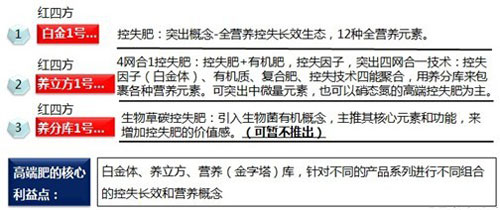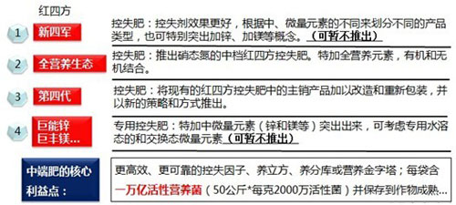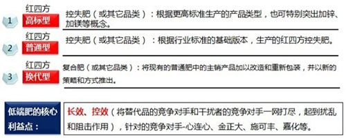 以控失肥的產品概念和農戶需求以及渠道策略為主線來規劃紅四方旗下的各控釋肥產品線;通過豐富的高中低端三個層次的產品線滿足市場需求,并炒熱市場。
