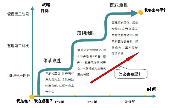 項目組提出:針對CC北方片區市場的實際情況和企業管理情況,營銷戰略要按三步走:體系制勝-結構制勝-模式制勝。首先,應該將市場由不可控變為可控,那就只能依靠體系的力量,把依托人(包括業務員和渠道渠道網絡)轉變為依托體系,市場先抓到公司手中;其次,在可控的基礎上,通過業務模式的變化,將細分市場,實現銷售、服務三個板塊或者三種業務模式將客戶和市場拆分,增強企業的抗風險性和彼此制衡,實現服務滲透客戶;最后,通過管理的變革,績效導向,實現各個利潤中心起頭并進,體系的力量最大化。