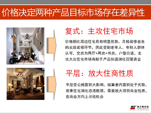 1、公寓產(chǎn)品市場(chǎng)認(rèn)可度較高,但兩種公寓產(chǎn)品市場(chǎng)熱度差別大,根據(jù)前期綠筑測(cè)算價(jià)格,復(fù)式公寓贈(zèng)送空間大,價(jià)格優(yōu)勢(shì)明顯,平層公寓無(wú)贈(zèng)送,且公攤高,缺乏市場(chǎng)競(jìng)爭(zhēng)力,由價(jià)格決定兩種細(xì)分產(chǎn)品目標(biāo)市場(chǎng)存在差異。復(fù)式相較周邊住宅具有明顯優(yōu)勢(shì),主攻住宅市場(chǎng),以年輕夫妻和老年家庭為主;平層細(xì)算套內(nèi)處于劣勢(shì),需要放大項(xiàng)目商業(yè)性質(zhì),在商業(yè)方向上尋找機(jī)會(huì),建議方向以中端商務(wù)公寓式酒店或小型辦公商務(wù)區(qū)為主。