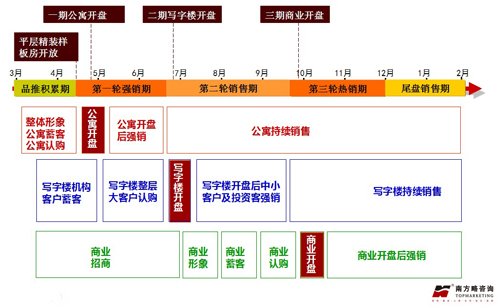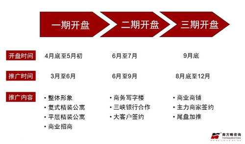 又根據(jù)時(shí)間規(guī)劃,建議項(xiàng)目分為三期推盤(pán),并對(duì)每次推盤(pán)的時(shí)間,宣傳推廣時(shí)間及推廣內(nèi)容做了明確的規(guī)劃及部署。