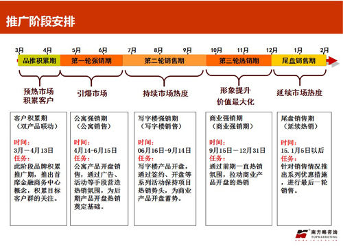 南方略根據項目的進度及全年營銷節點特征,結合全年推廣費用的預算安排,因地制宜選擇適合的推廣載體及手段,安排財富廣場的推廣階段及計劃!