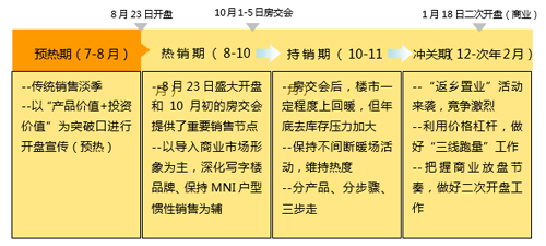 營(yíng)銷策略:根據(jù)開(kāi)盤銷售情況和推盤節(jié)奏,結(jié)合房交會(huì)重要銷售節(jié)點(diǎn),工作重點(diǎn)調(diào)整為:以導(dǎo)入商業(yè)市場(chǎng)形象為主,深化寫字樓品牌、保持MNI戶型慣性銷售為輔的思路。