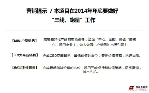 營(yíng)銷策略:核心在于對(duì)客戶需求的把握,細(xì)節(jié)的項(xiàng)目展示和氛圍營(yíng)造,巧妙的價(jià)格杠桿應(yīng)用、有效的開(kāi)盤控制、精準(zhǔn)的渠道選擇缺一不可,在2014年年底最大限度做好“三線、跑量”工作。
