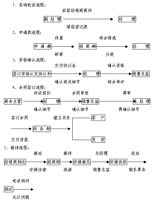 商務(wù)(招商)部是招商工作的執(zhí)行者,與經(jīng)銷商短兵相接,擔(dān)負(fù)著商務(wù)談判、招商回款等重任,建立、健全客戶檔案,加強各戶管理,保持與客戶間雙向溝通;市場竄貨問題處理;退貨的處理;。一般設(shè)置經(jīng)理、大區(qū)經(jīng)理、協(xié)銷經(jīng)理及商務(wù)助理若干。